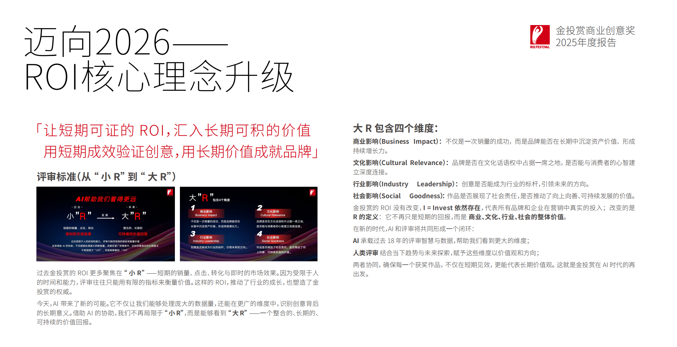 报告指出,2025年是金投赏的“成人礼”,也是商业创意标准的进化元年。同时预告了,2026年金投赏评审体系将进行战略性升级:从衡量即时转化效果的“小R”(ROI),全面转向具备长期视野的“大R”体系。